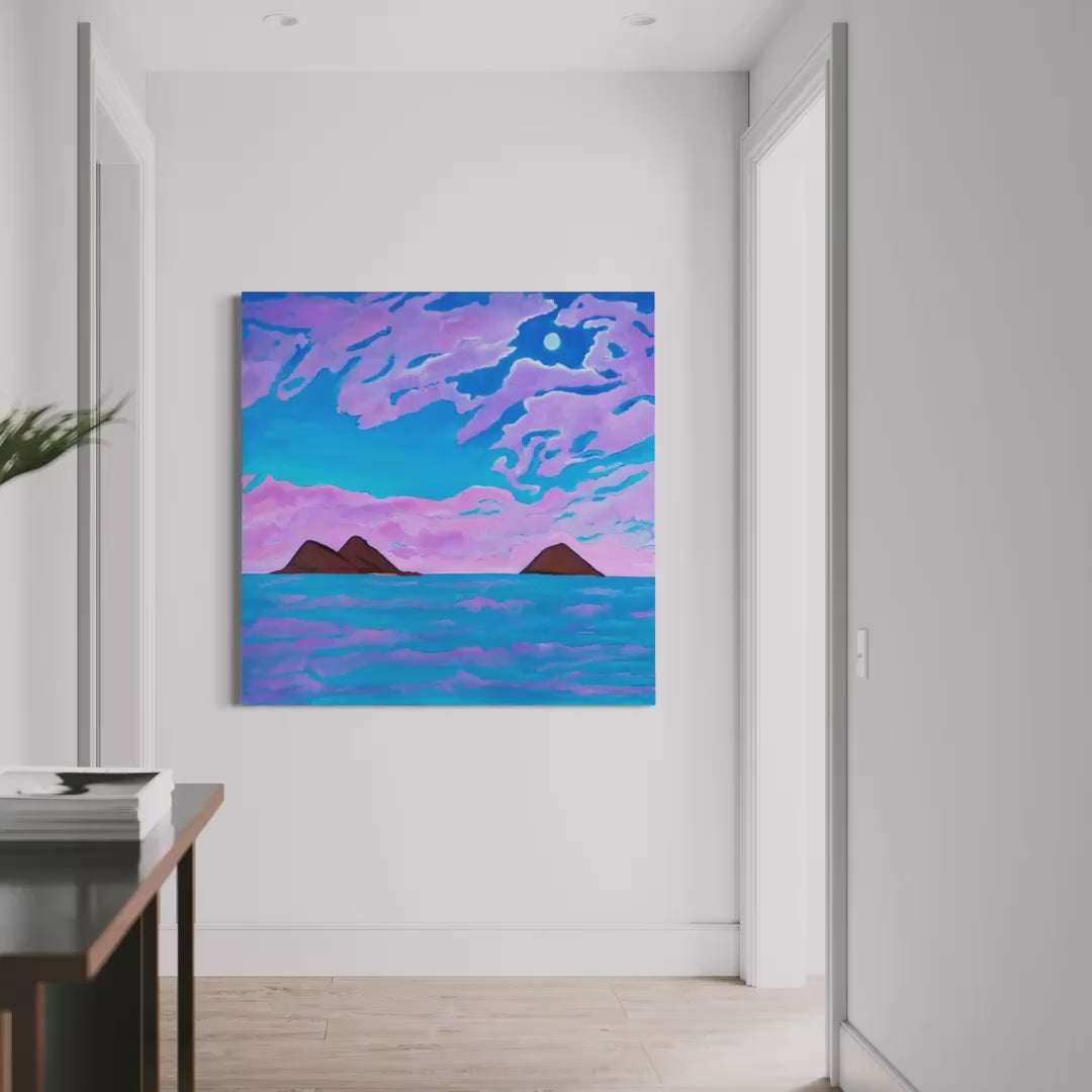 "This Dream Series Painting is a throwback to my first home in Hawaii back in 1997 titled 'Dreams of Lanikai'. My spirit was ignited to paint a place that is so dear to my heart. I would go sleep every night to this view of the islands from my bedroom window. It takes me back to simpler times when we raised my baby daughter Sami (who is now a grownup) in a sweet quiet little beach haven with her Dad. Our life consisted of me being a UH Manoa college student, and paddling for Lanikai Canoe Club.
