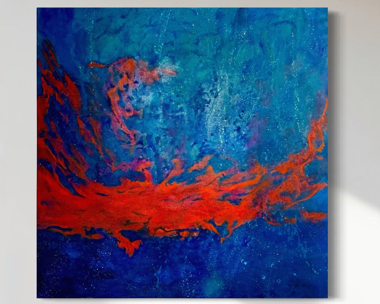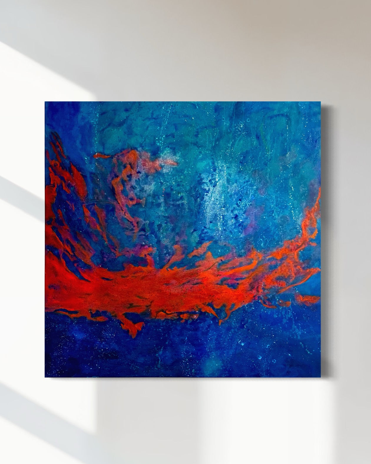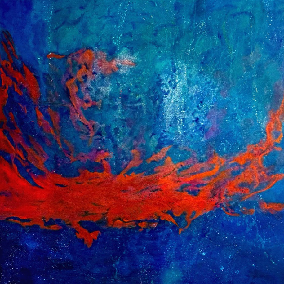 Inspired by the coastal volcanic flow/eruption of Kilauea on the Island of Hawaii. The energy and movement of the paint and brush represents Pele and her older sister Namaka, the sea goddess, as she is embracing her sister Pele as lava flows into the arms of the ocean.