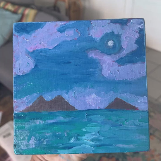 "This Dream Series Painting is a throwback to my first home in Hawaii back in 1997 titled 'Dreams of Lanikai'. My spirit was ignited to paint a place that is so dear to my heart. I would go sleep every night to this view of the islands from my bedroom window. It takes me back to simpler times when we raised my baby daughter Sami (who is now a grownup) in a sweet quiet little beach haven with her Dad. Our life consisted of me being a UH Manoa college student, and paddling for Lanikai Canoe Club.