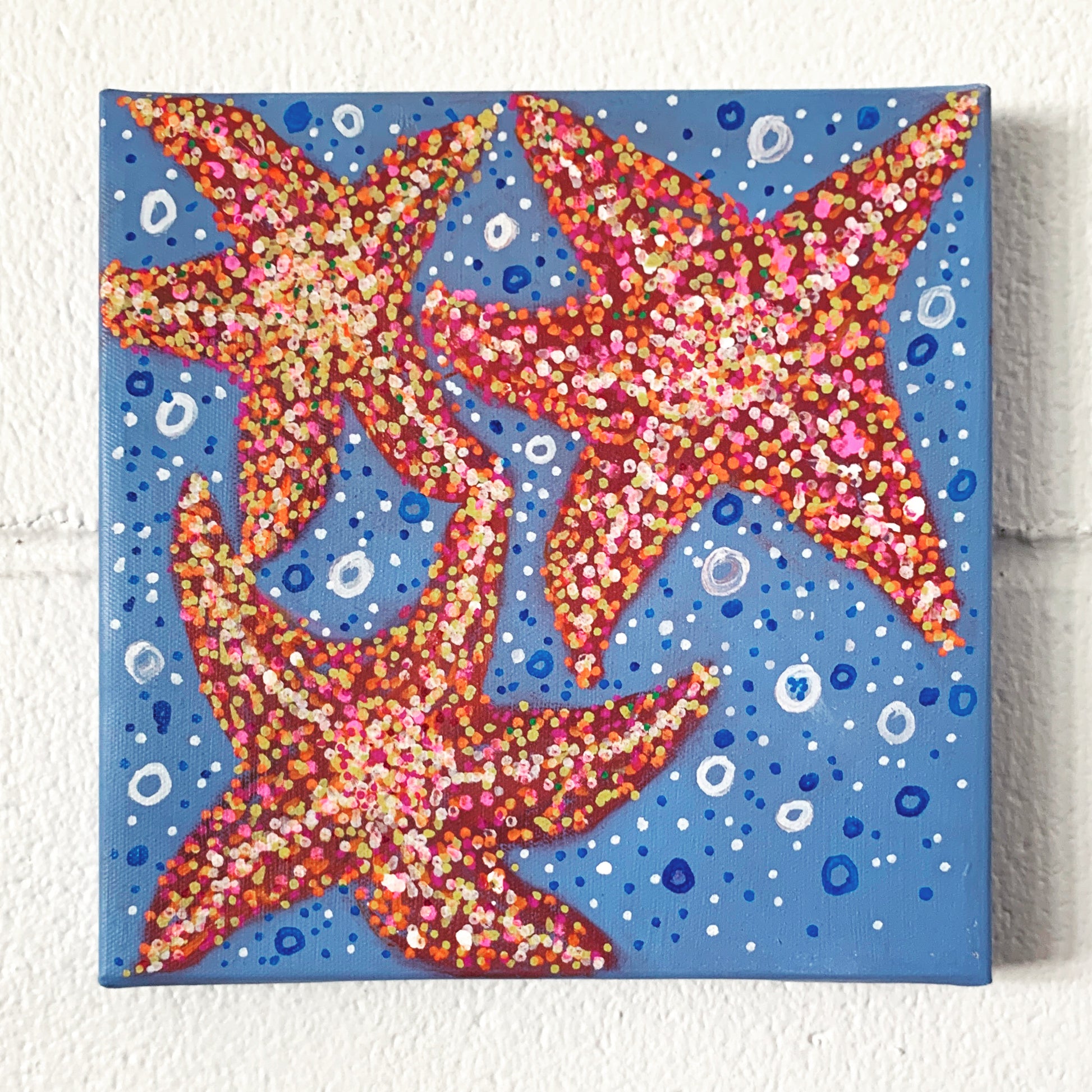 "For me...this original paint series is very symbolic. I have always been intrigued with How do I create symbolic meaning and demonstrate 1+1=3? Well for me it was our starfish, and our starfish starfish, and how the ripple effect keeps going, like a mom and dad and then baby" Juanita Aguerrebere