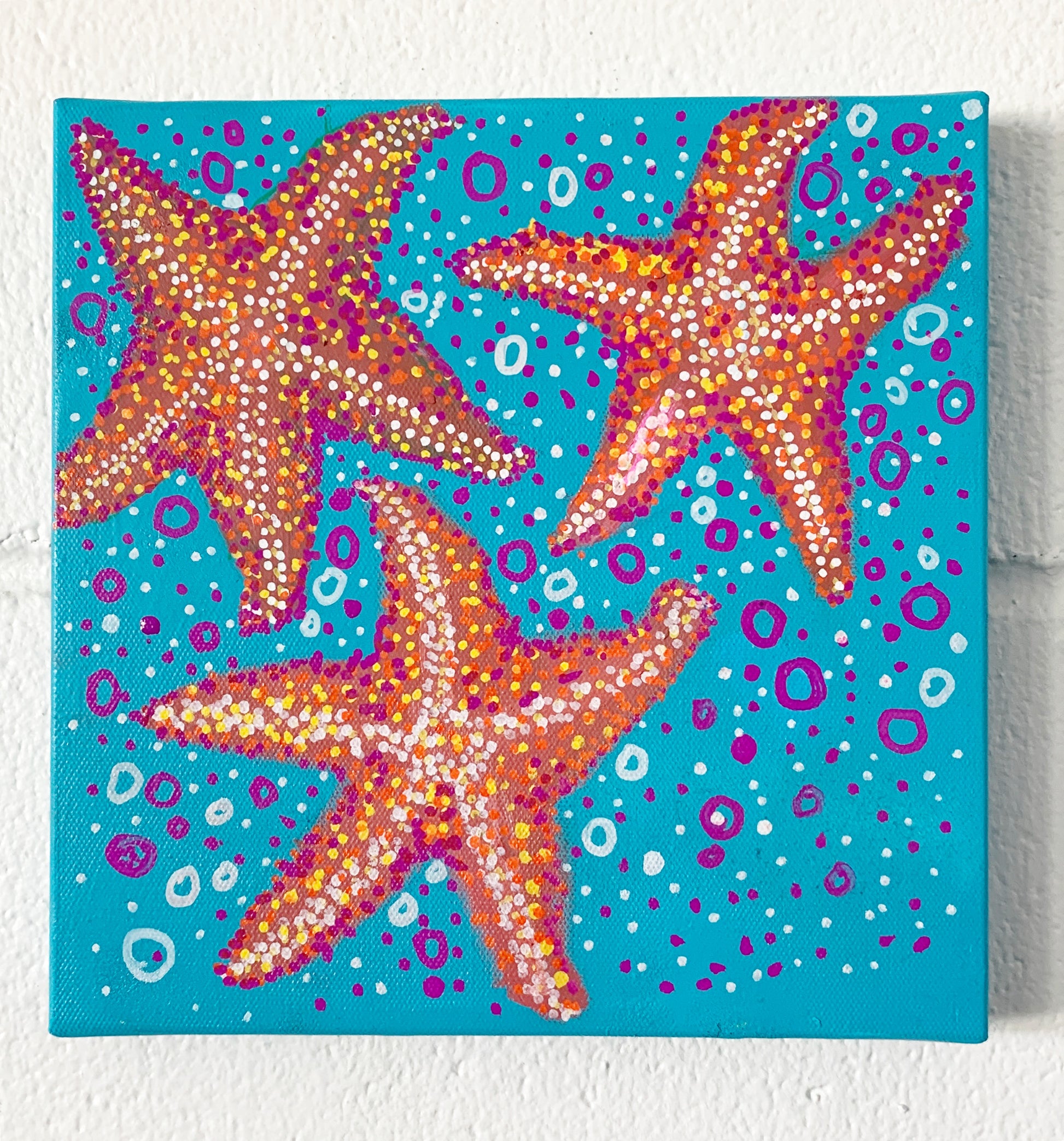 "For me...this original paint series is very symbolic. I have always been intrigued with How do I create symbolic meaning and demonstrate 1+1=3? Well for me it was our starfish, and our starfish starfish, and how the ripple effect keeps going, like a mom and dad and then baby" Juanita Aguerrebere