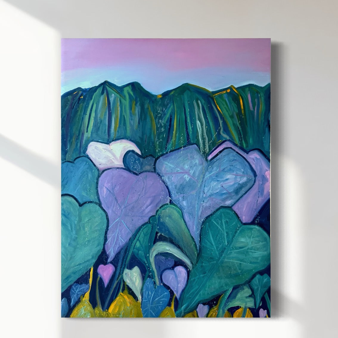 Created during a New Year's Eve gathering in 2021 on a friend's farm in Waimanalo, Ua (Rain) Waimanalo captures a contemporary vision of night under steady rainfall. The Koolau Mountain range frames the taro fields (lo'i), symbolizing a meaningful reminder to malama the aina—care for the land. This original oil painting on a 30x40 inch canvas belongs to the Dream series, reflecting a tradition of stewardship and urging respect for the land across generations. Complimentary worldwide shipping is included.